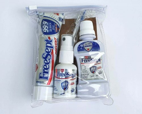 Em bolsa, escova de dente, Fio dental 45cm e Pasta de dentes Freesept.
