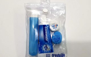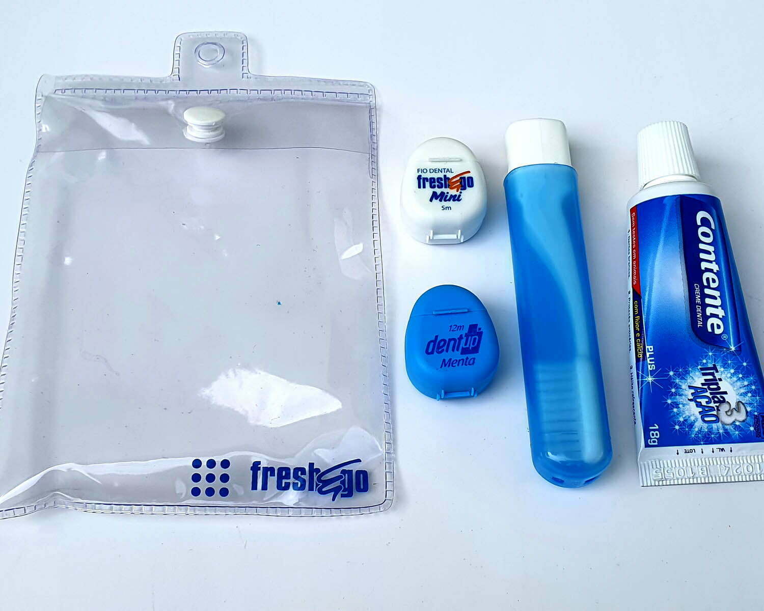 Em bolsa, escova de dente, Fio dental e Pasta de dentes Contente.